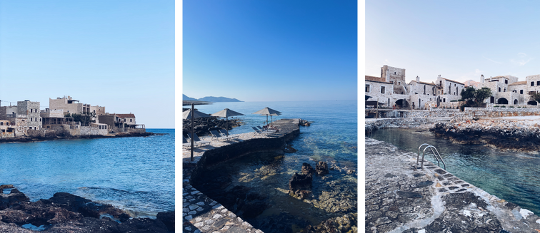 Depuis Kalamata, on descend vers le Sud. Premier arrêt : Kardamyli. Un petit stop parfait dans une des tavernes du bord de mer avant un premier bain en mer Ionienne depuis le quai Tikla.
